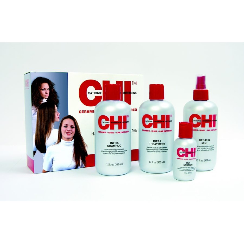 Ce kit comprend 4 produits CHI spécifiques pour retrouver des cheveux sains et soyeux même après un traitement tels que coloration ou permanente ammoniaque ou semi-ammoniaque, défrisage à la soude, lissage avec des fers traditionnels qui brûlent les cheveux.
